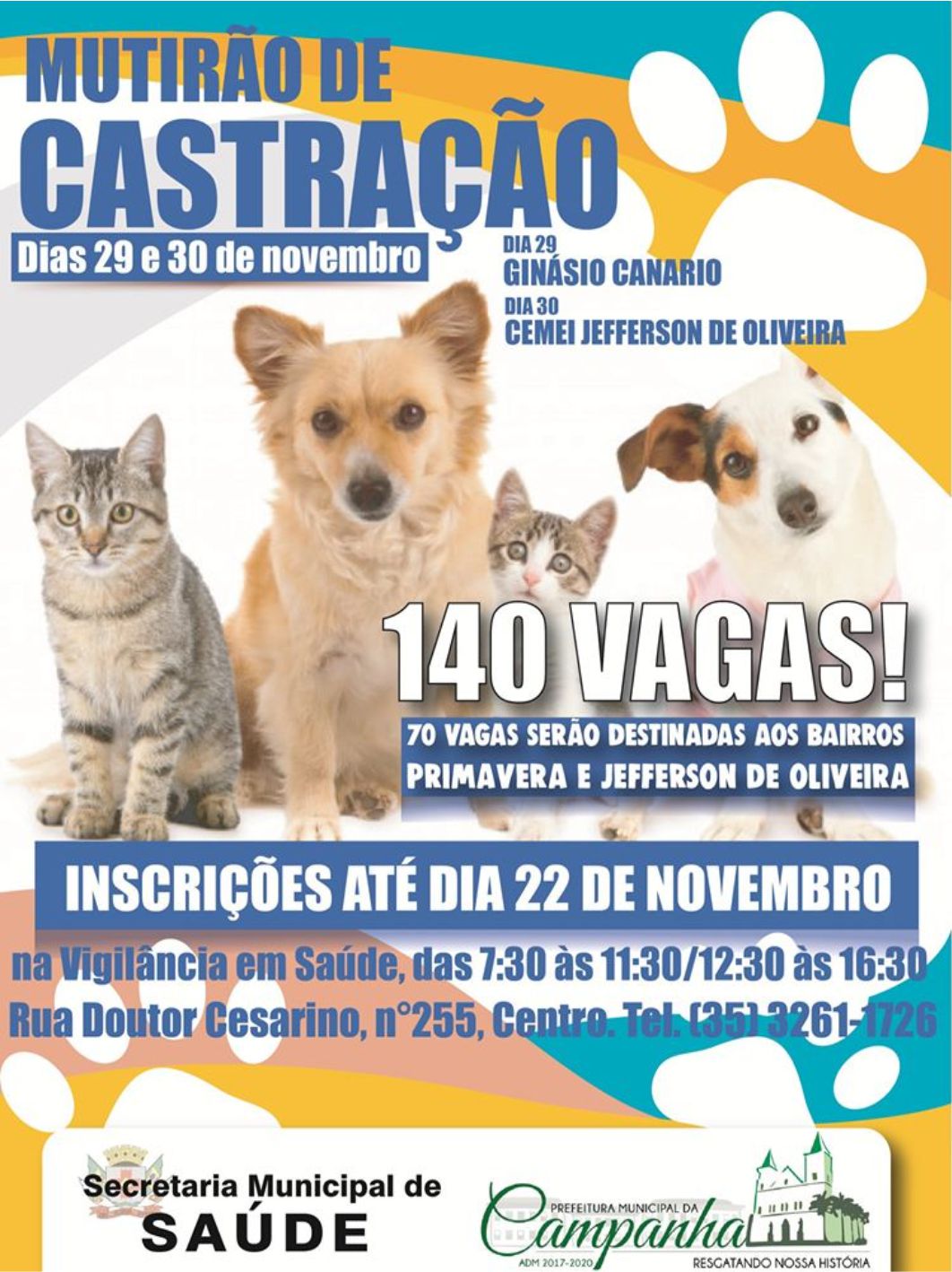Vem aí o Mutirão de Castração de Cães e Gatos, que será realizado pela Prefeitura Municipal, nos dias 29 e 30 de novembro. A castração será gratuita e a Prefeitura disponibilizará 140 vagas, sendo 70 vagas destinadas a cães e gatos dos Bairros Primavera e Jefferson de Oliveira (COHAB).